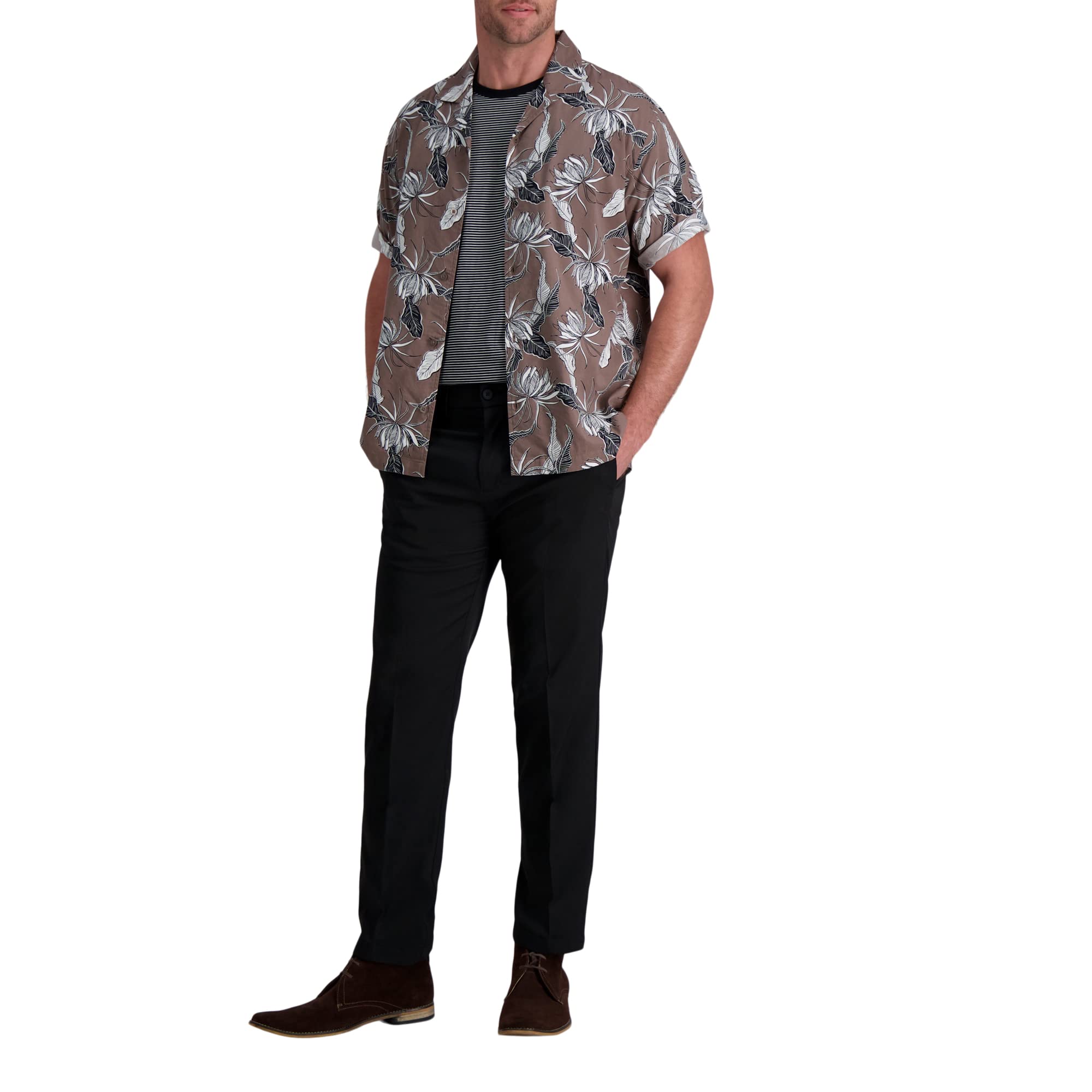 - CAMP SHIRT: Introducing the Haggar camp shirt with a short sleeve floral print. The straight hem, which is intended to be worn untucked, encapsulates the comfort of cotton and stretch while providing a casual, laid-back appearance.