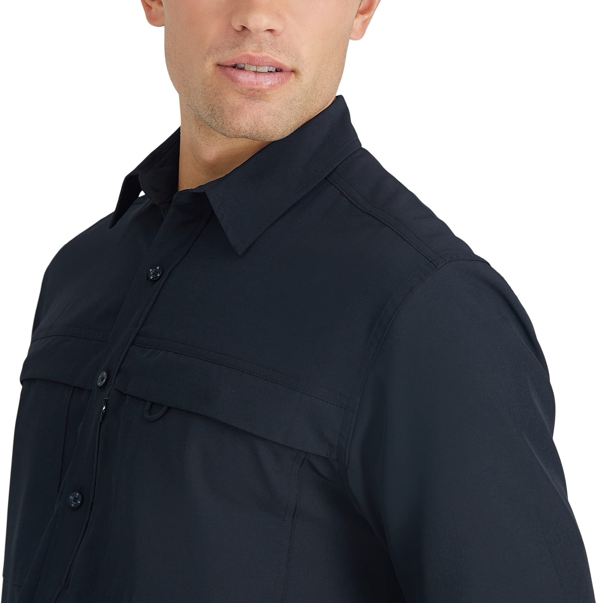 - THE ACTIVE SERIES: Stylish and Comfortable. This Regular fit shirt is designed to keep up with your active lifestyle. Featuring 4 way stretch, breathable mesh vents, and patch pockets. The hidden tech pocket provides convenient storage options.