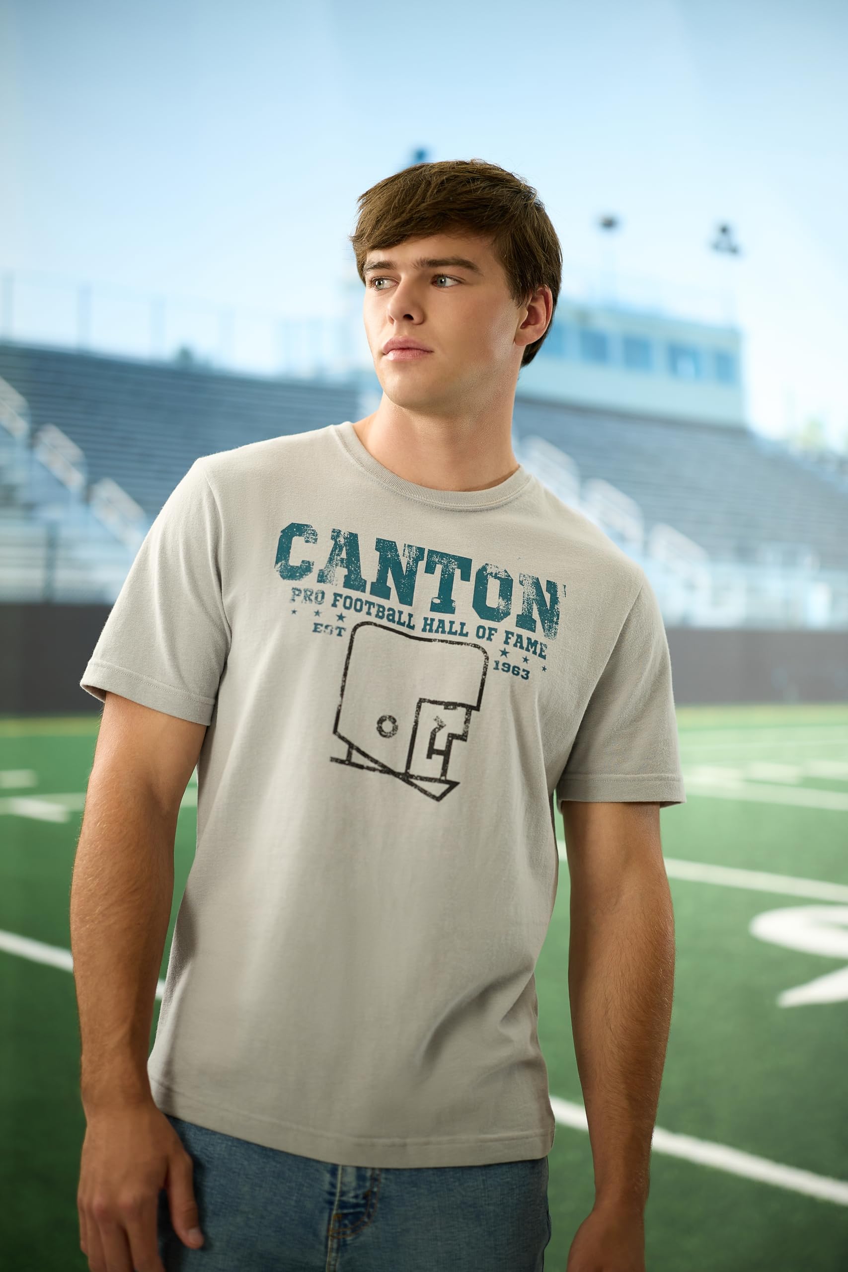 - CANTON,OHIO GRAPHIC PRINT: Crafted from a premium cotton blend, this heavyweight t-shirt delivers an irresistibly soft feel. Celebrate the Hall of Fame's home in Canton, Ohio and honor its legacy with a custom full color screen printed design.